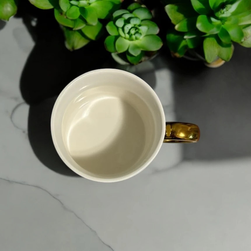 Tento elegantní a stylový hrnek zaujme na první pohled svým minimalistickým designem. Bílý hrnek s černými tečkami je skvélé doplněním každé kuchyně nebo pracovního stolu, a jeho zlatý úchyt přidává nádech luxusu.