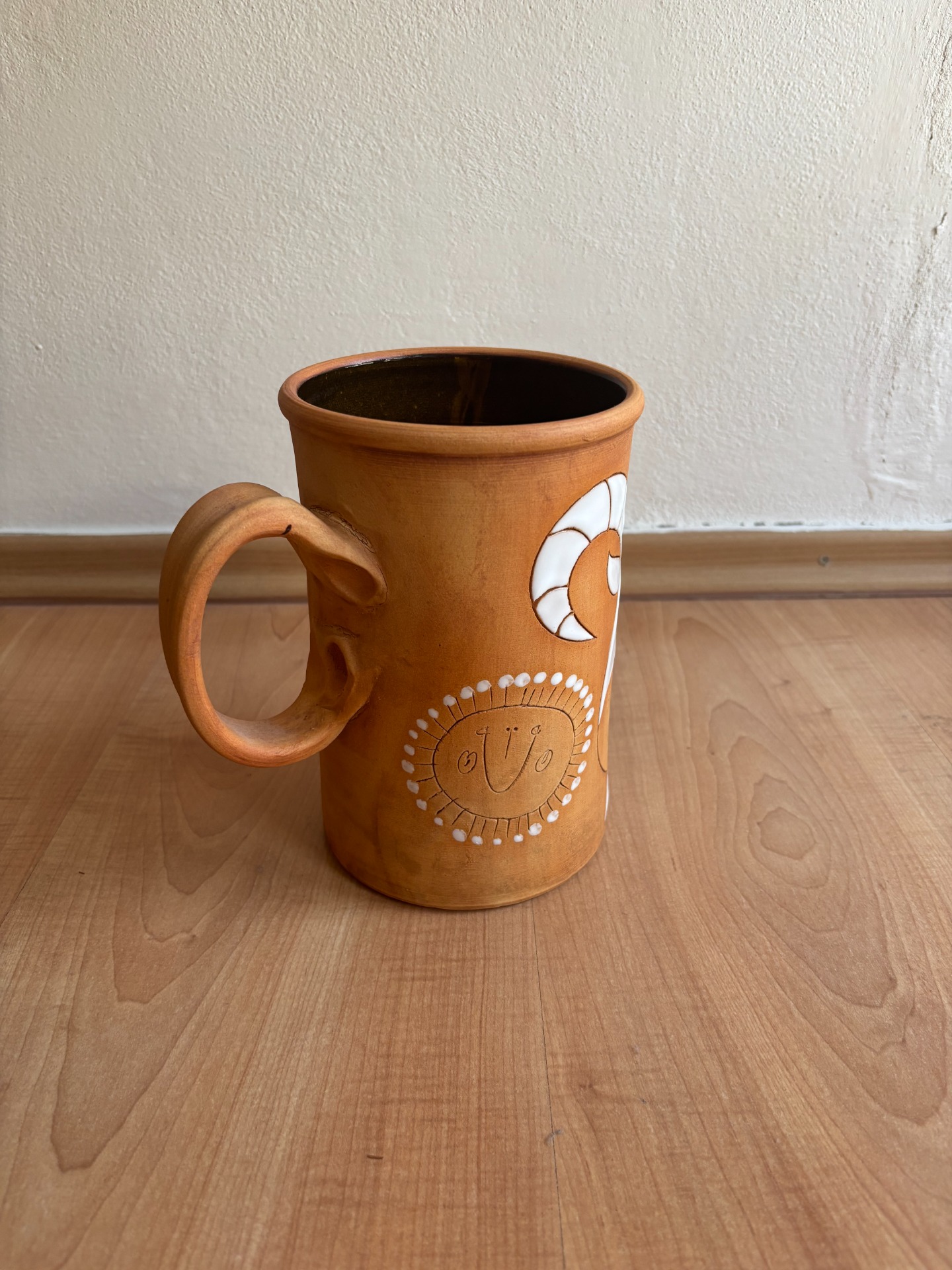 Tento keramický hrnek zaujme svým přírodním vzhledem a jemnými ručně zdobenými detaily. Teplý hnědý odstín doplňují bílé dekorativní prvky a jednoduché motivy, které dodávají hrnku originální a osobitý charakter.